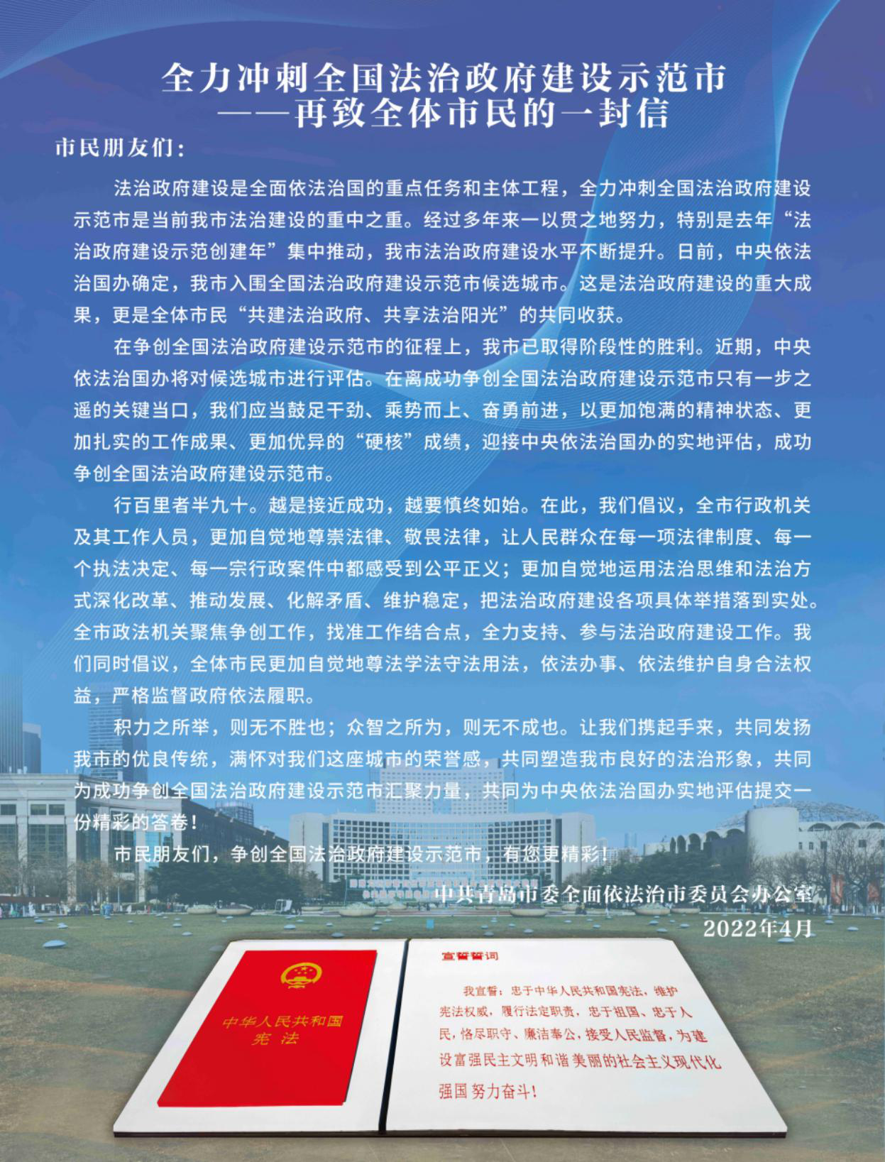 根據(jù)市國資委的通知要求,原定于5月底前到青島市開展的全國法治政府建設(shè)示范市創(chuàng)建第二輪復(fù)核工作延后,預(yù)計(jì)近期到達(dá)。屆時(shí)將迎來中央依法治國辦對(duì)青島市全國法治政府建設(shè)示范市創(chuàng)建工作的一次全方位大考。