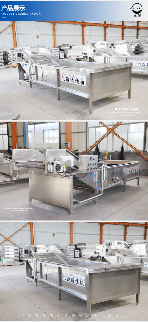 諸城市光銳機(jī)械有限公司為客戶設(shè)計各種型號的氣泡清洗機(jī),清洗果蔬等物料。產(chǎn)品規(guī)格可根據(jù)產(chǎn)品的質(zhì)量要求專門加工定做。 設(shè)備除電機(jī)、軸承等標(biāo)準(zhǔn)件外均采用不銹鋼SUS304/2B材料制作,符合衛(wèi)生要求。設(shè)備中設(shè)有氣泡發(fā)生裝置,使物料呈翻滾狀態(tài),去除產(chǎn)品表面農(nóng)殘功效,同時可加入適量的藥劑,進(jìn)行消毒固色,漂浮物可以從溢流槽溢出,沉淀物從排污口排出,以達(dá)到清洗的目的。蔬菜類如:芹菜、菠菜、小白菜等葉類蔬菜的清洗。也可適用于金銀花、香葉、荊芥等調(diào)味品的清洗。還可適用于包裝袋的清洗、海帶等醬腌菜的清洗。
